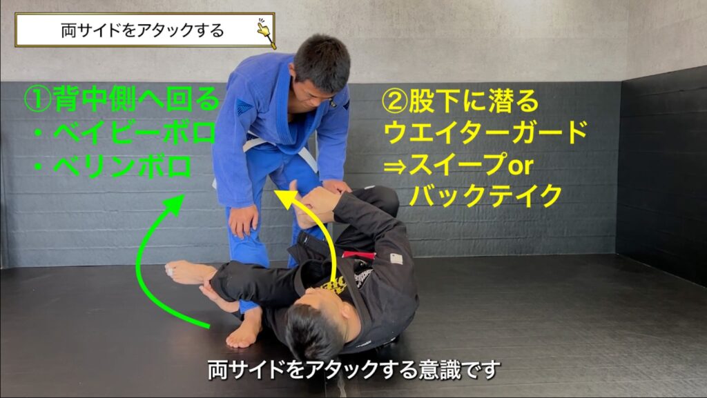 ここから狙えるのは、①(通常のデラヒーバと同じく)相手の背中側に回ったり、②相手の股下に潜ってウェイターガードでスイープorバックテイクの2つルートです。