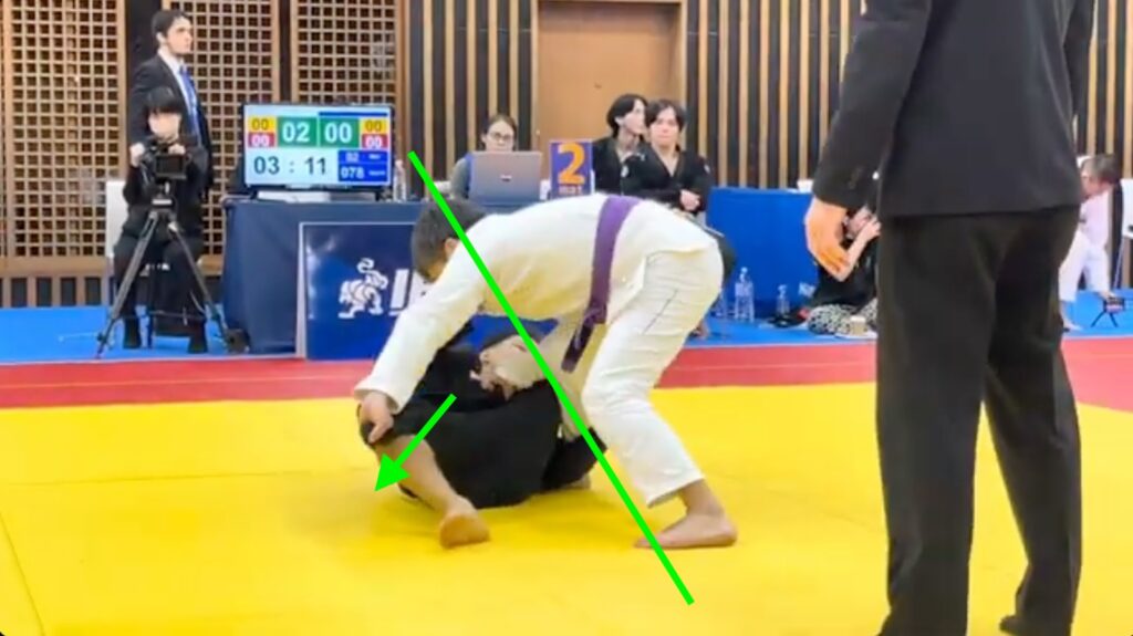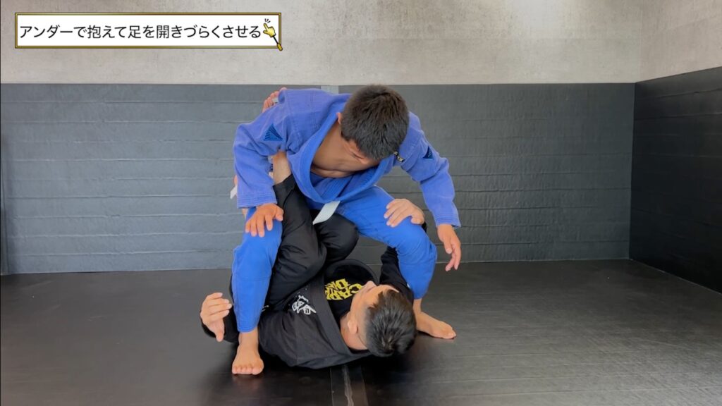 また、パンツを持って柔術立ち(テクニカルスタンドアップ)してスイープを狙う場合も、アンダーフックをしていると起き上がることができません。