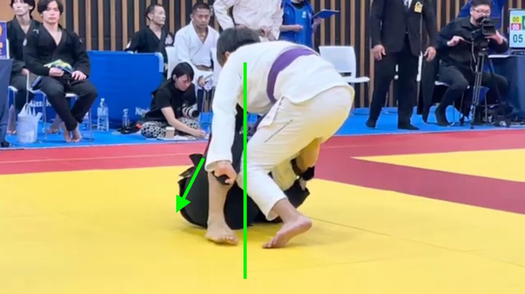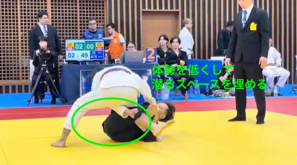 もし相手が右足をこちらの体の内側に入れてきたり、股下に潜ってきそうな場合は、まずは体勢を低くして相手が真下に潜るスペースを狭くします(埋める)。