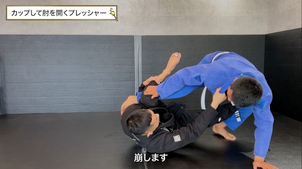 前重心を保ったままプレッシャーをかけ、ジリジリとデラヒーバフックを解除していくことが重要です。