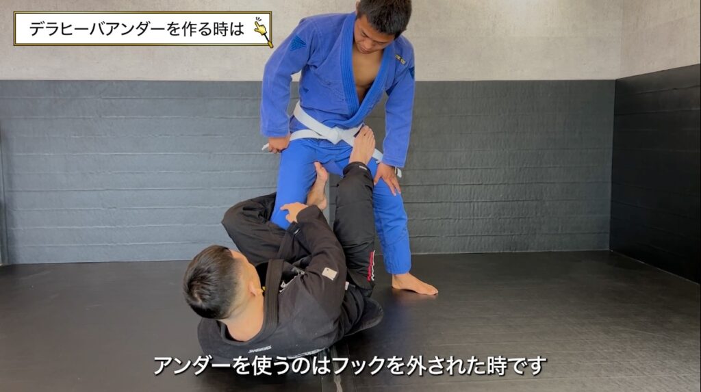 よくあるケースとしては、通常のデラヒーバを仕掛けたものの、相手が膝を外に開いて、フックを落とされそうな時。こういう場面ではアンダーフックでサポートすることで相手の足の固定を強化できます。防御力に優れています。相手もアンダーを作られると、簡単に足を抜くことができなくなります。