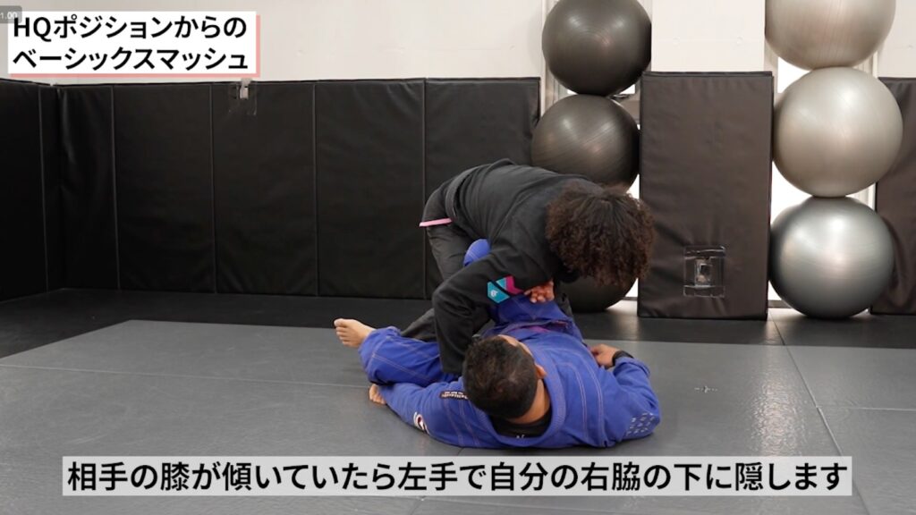 トップの相手の右足に対して、(左腕)アンダーフック、(左足)デラヒーバフックをつける、いわば2on1の状態です。簡単に外されることはありません。