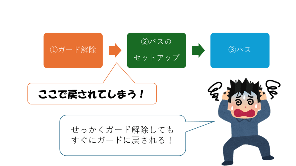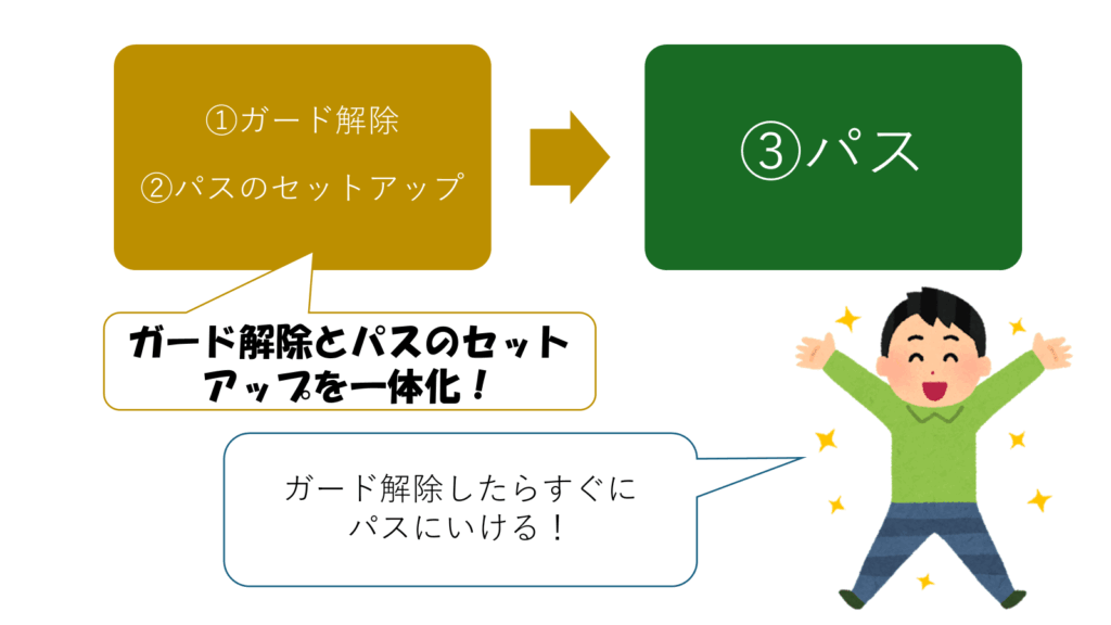先述したように、本教則のテクニックはガード解除とパスのセットアップがセットになっているので、解除したらすぐにパスに行けます。
