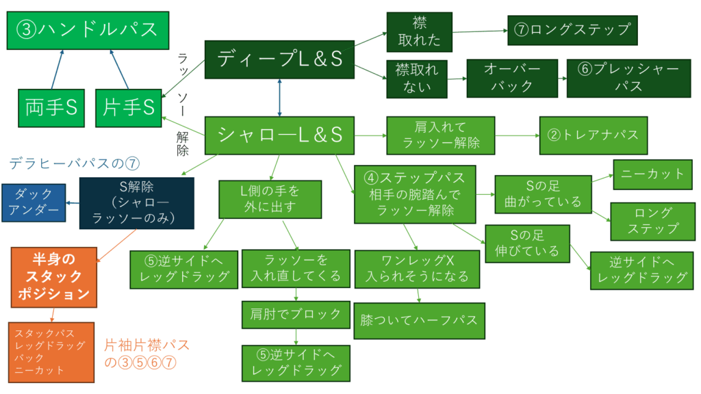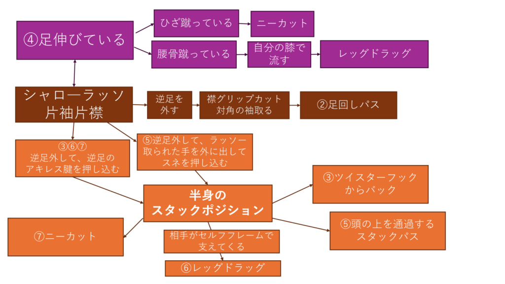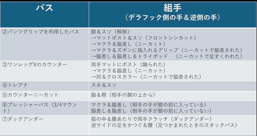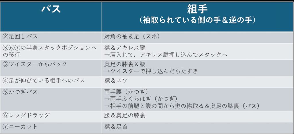 最初に各ガードに入ってしまった時の注意点とベースの取り方について説明して、相手の手足の位置やリアクションに応じたパスを説明しています。