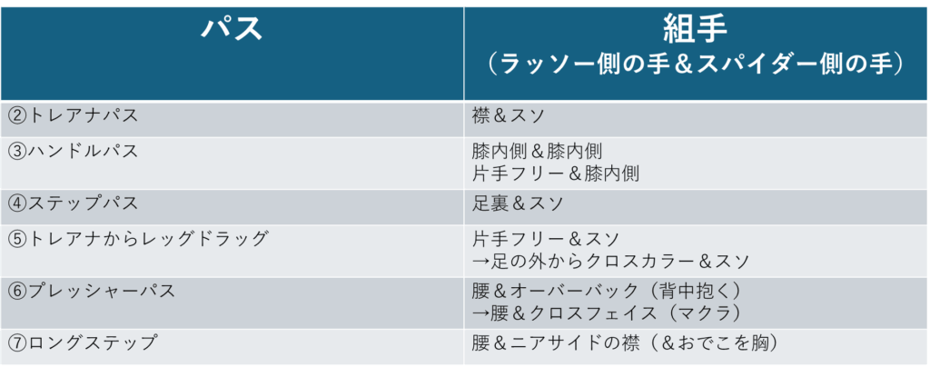 5.トレアドールパスからレッグドラッグパスへの移行(ラッソースパイダー編)