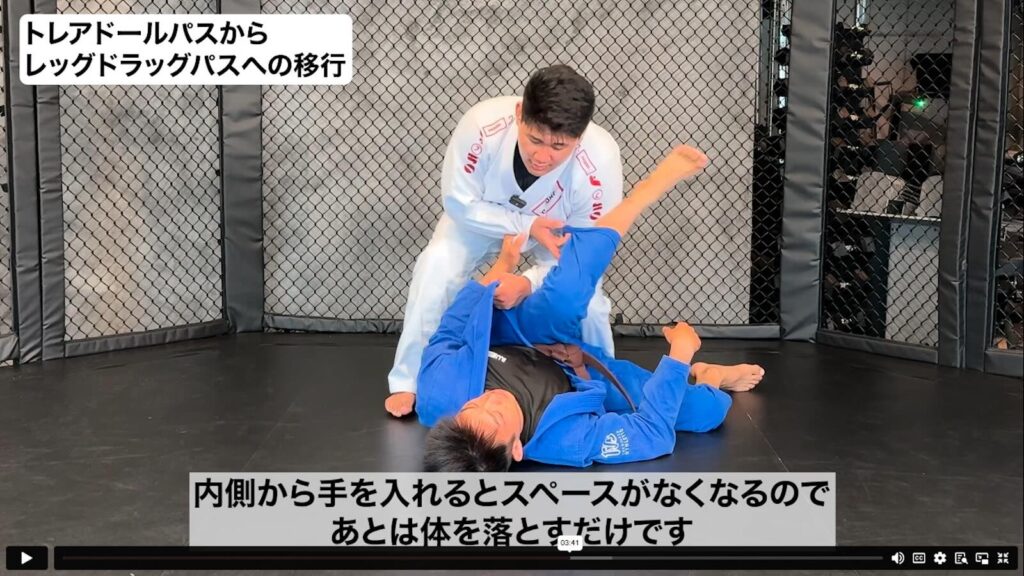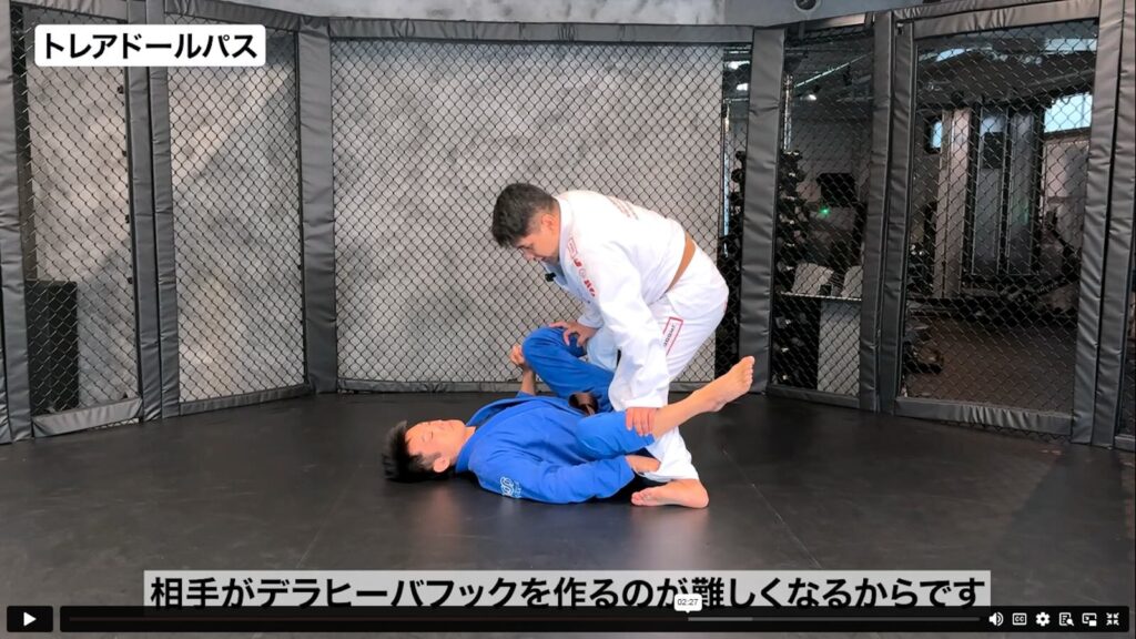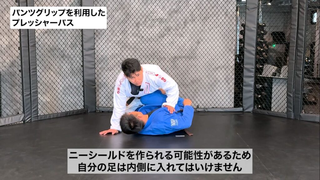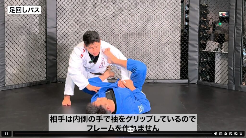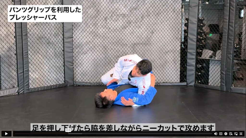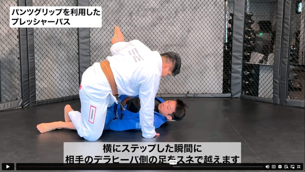 本教則にもプレッシャーパスは紹介されていますが、実戦だとトレアナやレッグドラッグなどを仕掛けたときに、ニアパスでハーフガードにつかまることがよくあります。そこからの展開も習得しておくとより強力なパスシステムとなります。
