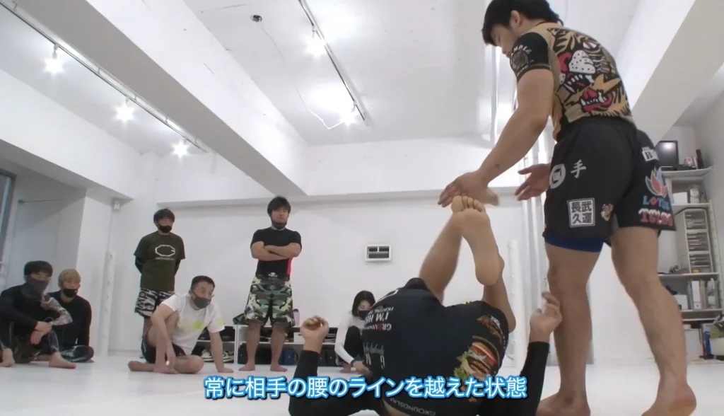 オープンガードで足が効く相手に対して、相手の腰のラインを超えた状態をキープして相手を疲れさせます。