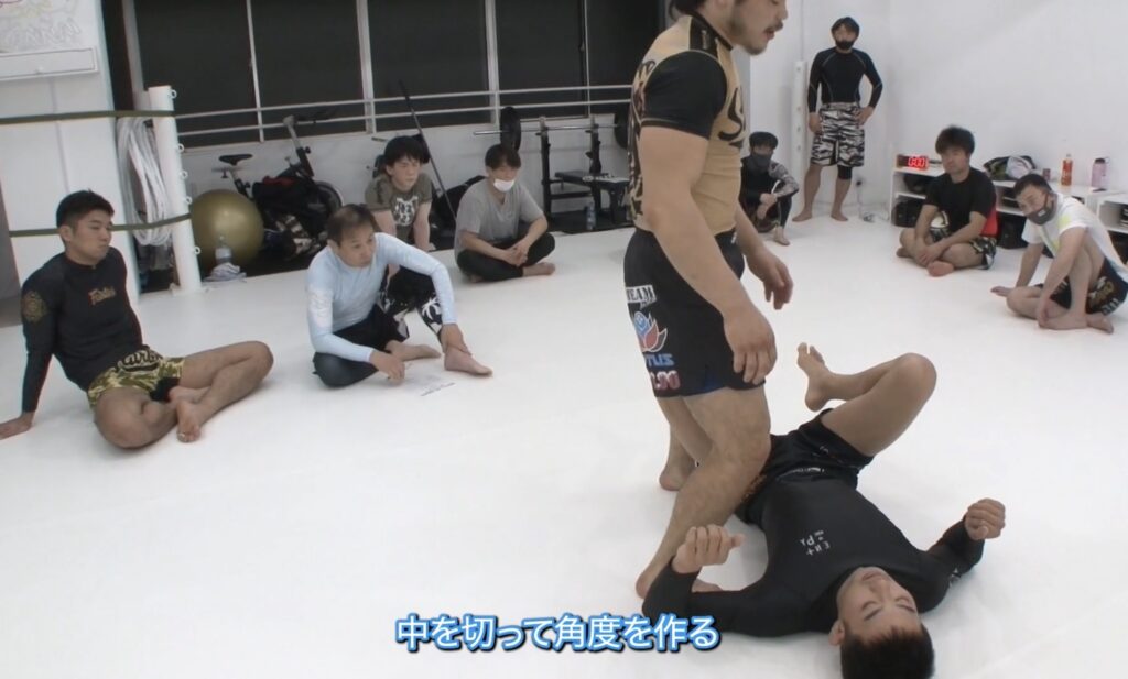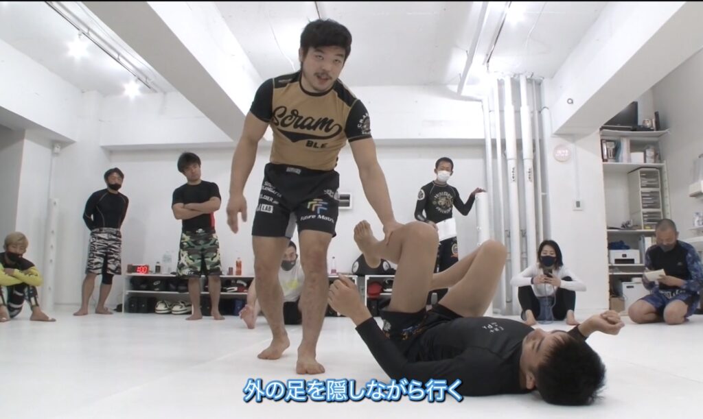相手の足が広く、足の外に出れない時の角度の作り方を説明しています。この場合ではリバースデラヒーバを狙います!
