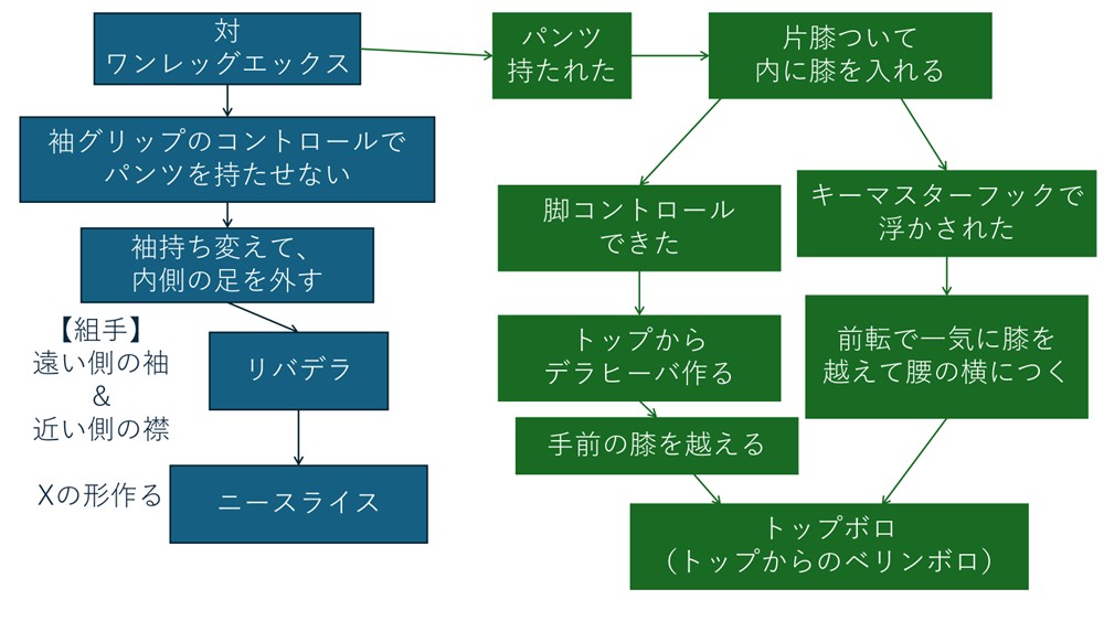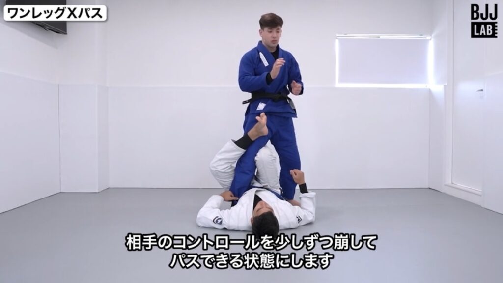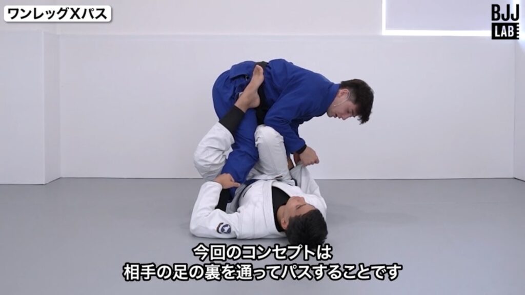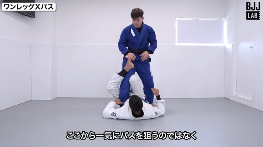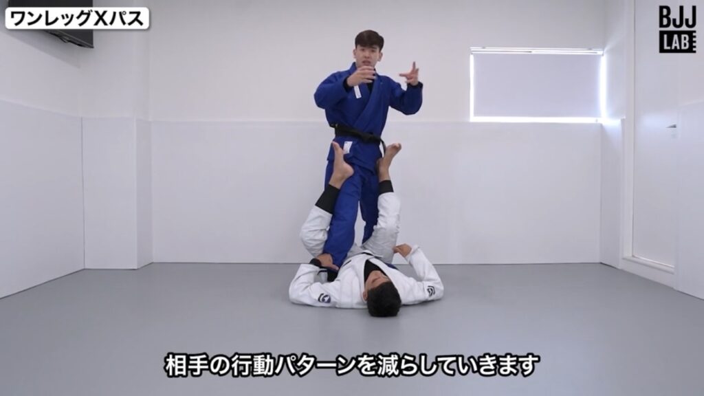 たとえばワンレッグエックスへのパスガードでは、最初に「外足のフックの解除」をするのではなく「袖グリップを取る→内足のフックの解除」を行います。