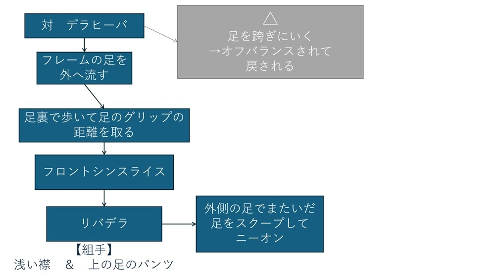 本教則のパス:足を使ってリバデラフックを解除して足を流した蹲踞(そんきょ)ベースの形を作ってそこから相手のリアクションに合わせてアタックしていく。
