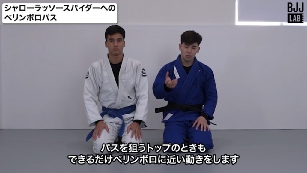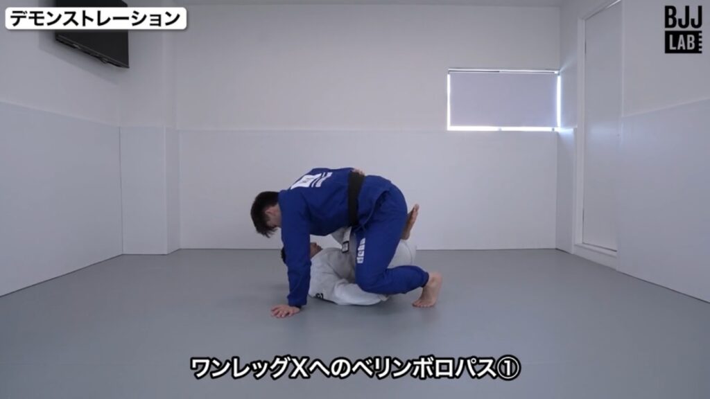 本教則のパス:ベリンボロで相手の裏(バック)について相手のプレッシャーを外し、相手のグリップとガードを解除してそこからパスガードを仕掛ける