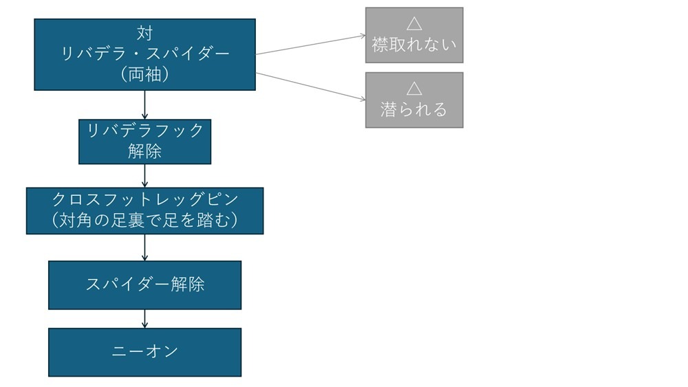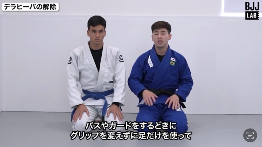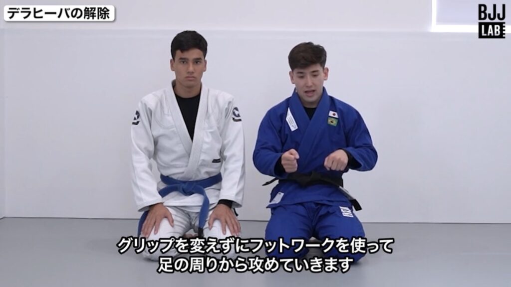 本教則の対処:プレッシャーをかけず、まずリバデラフックを解除して足裏で相手の足を制してからパスガードする