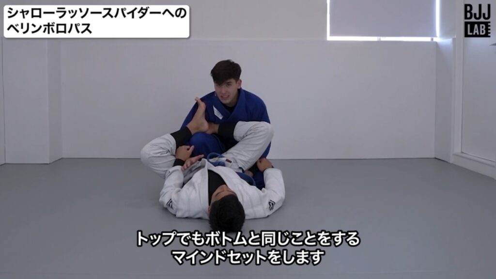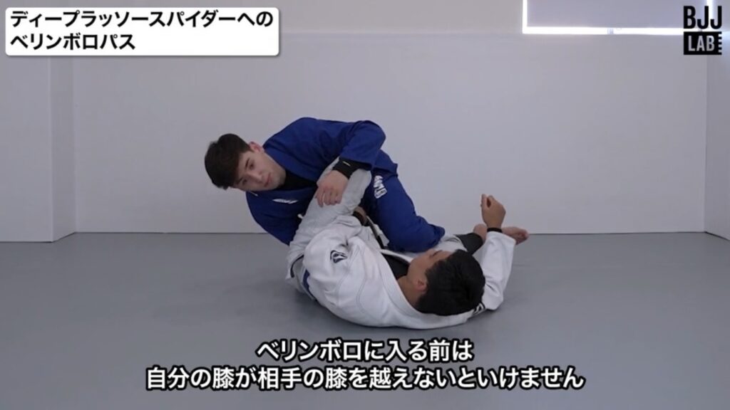 本教則のパス:相手のアタックを封じる股を閉めた片膝のベースを取って、トップからのベリンボロで切り返す。