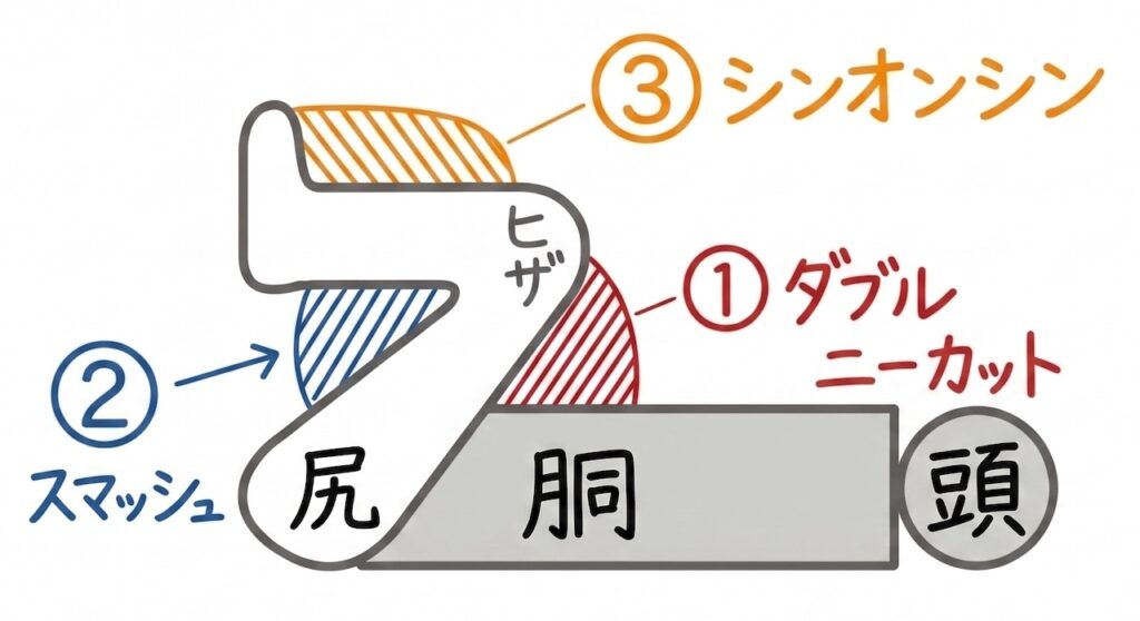 ③カカトも膝も引きつけていている(スネの前にスペースがある)