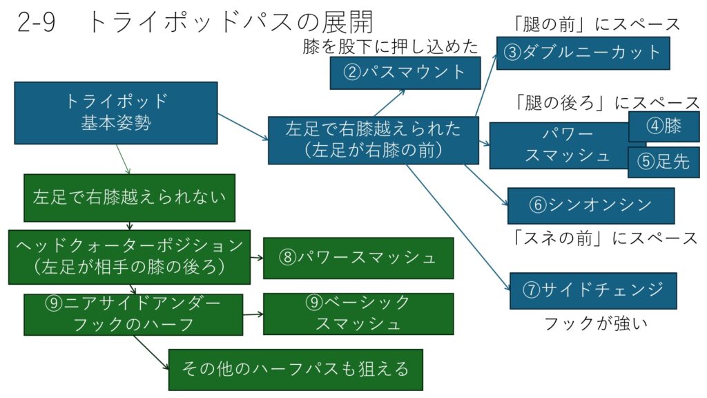 前半のチャプターではトライポッドパスのバリエーションを紹介しています。一つの技を狙うのではなく、相手のリアクションに合わせて最適な技を出すことで強力なパス「システム」になります。