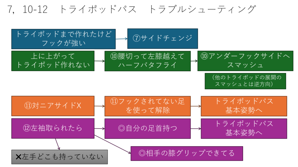 トライポッドパスをやるときの「あるある」の問題と対策がまとめられています。スパーリングでこのシチュエーションになったときにこのテクニックでパスするとめちゃくちゃ気持ちよかったです。