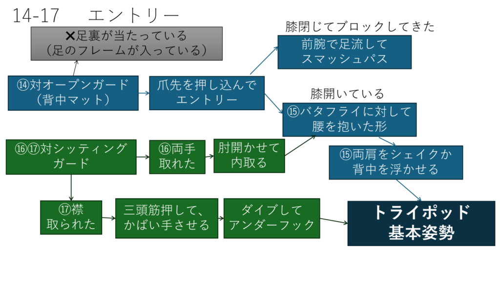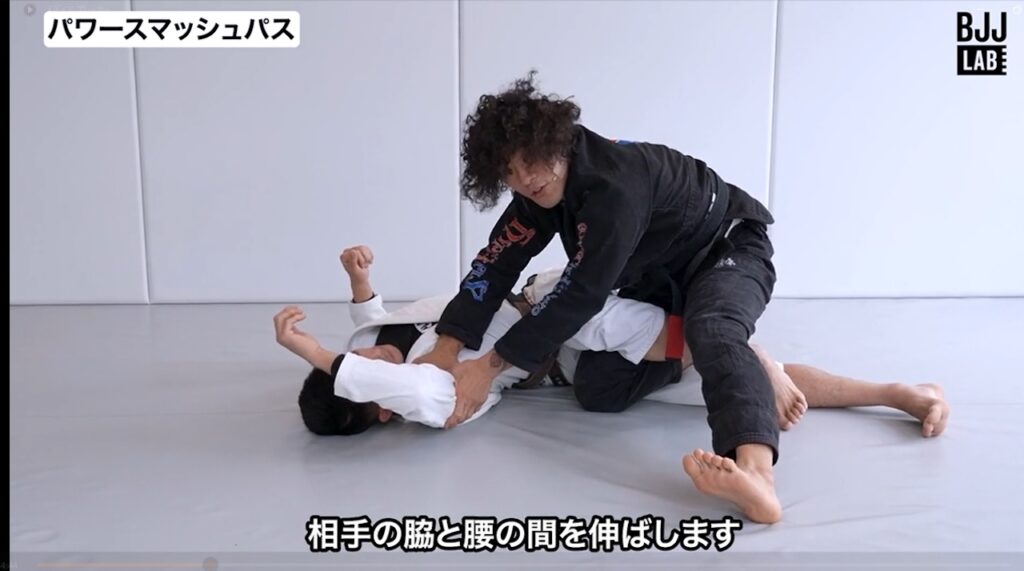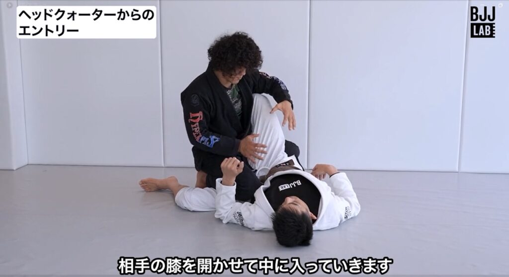最後はヘッドクォーターやハーフからのトライポッドパスのエントリ-です。相手の体をフラットにして力が入らない形にさせてパスガードするテクニックです。