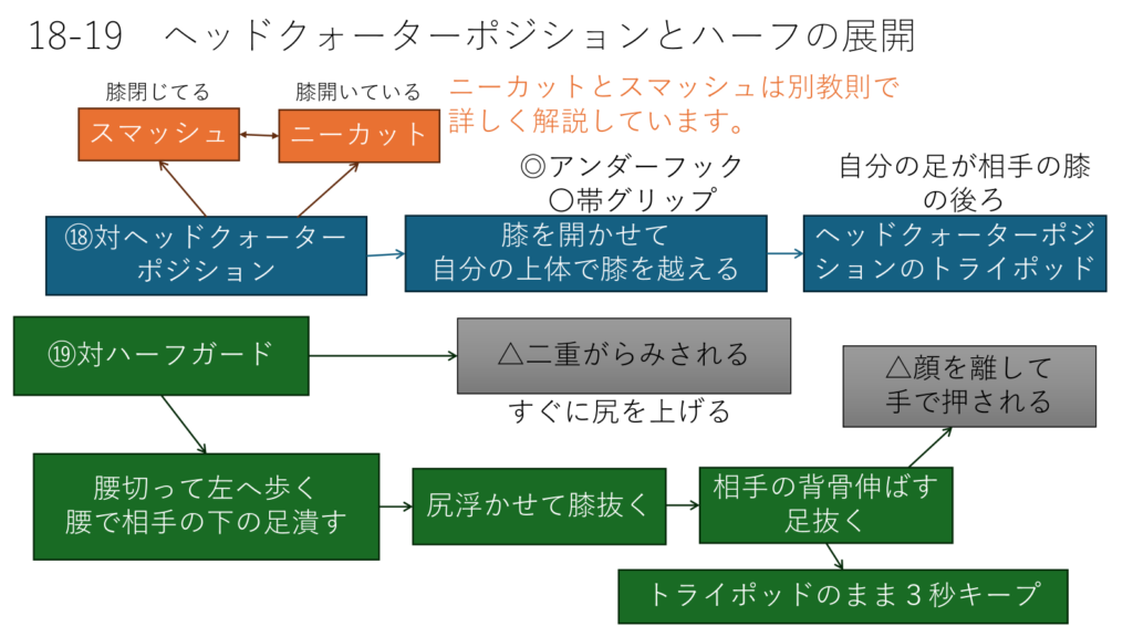しかしハーフを取られても、チャプター19で紹介されていた強力なハーフに対するトライポッドパスにそのまま移行できるので最終的にはパスできることが多かったです。組手を変えずに移行できるので相手にいい形に戻されることが少ないです。