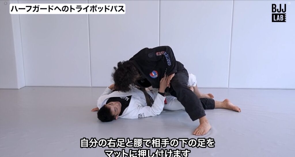 トライポッドパスは「上半身を制する→下半身(足)を越える」の順番なので、パスして即抑え込みになります。これはボトムからすると非常に厄介です。足を越えられてないだけで制されている形です。