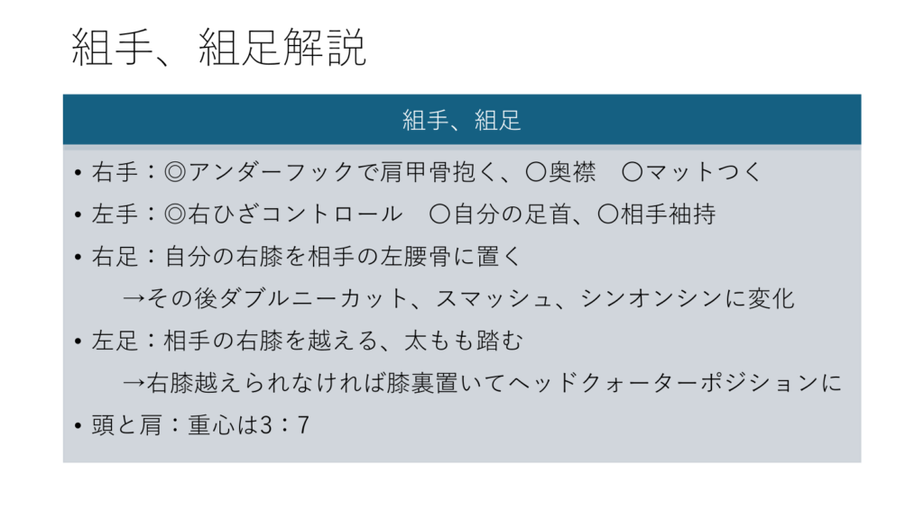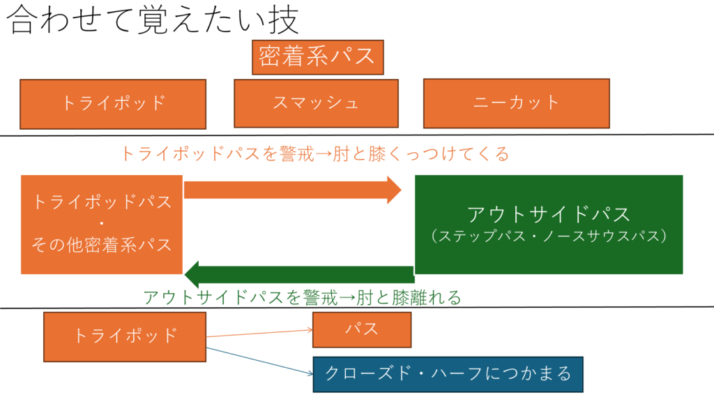 トライポッドパスは失敗すると、ハーフにつかまったり、クローズドに入ってしまうことが多々あります。そういったときの保険としてハーフとクローズドの対処は身に着けておきましょう。
