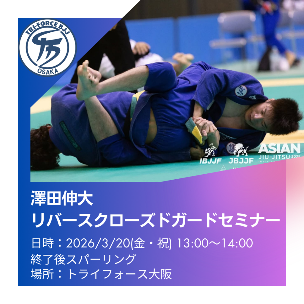 【主催者サイトより引用】 3/20 (祝・金)に 澤田伸大先生の「リバースクローズドガード」 セミナーをトライフォース大阪にて開催します。 【日時】 3月20日…