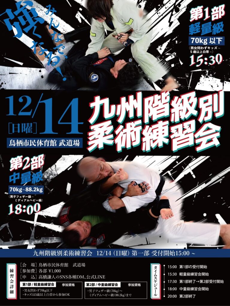 【主催者SNSより引用】 10月に開催して大好評だった階級別柔術練習会の第二弾を12/14(日)鳥栖市民体育館にて開催いたします‼︎ 今回はキッズ…